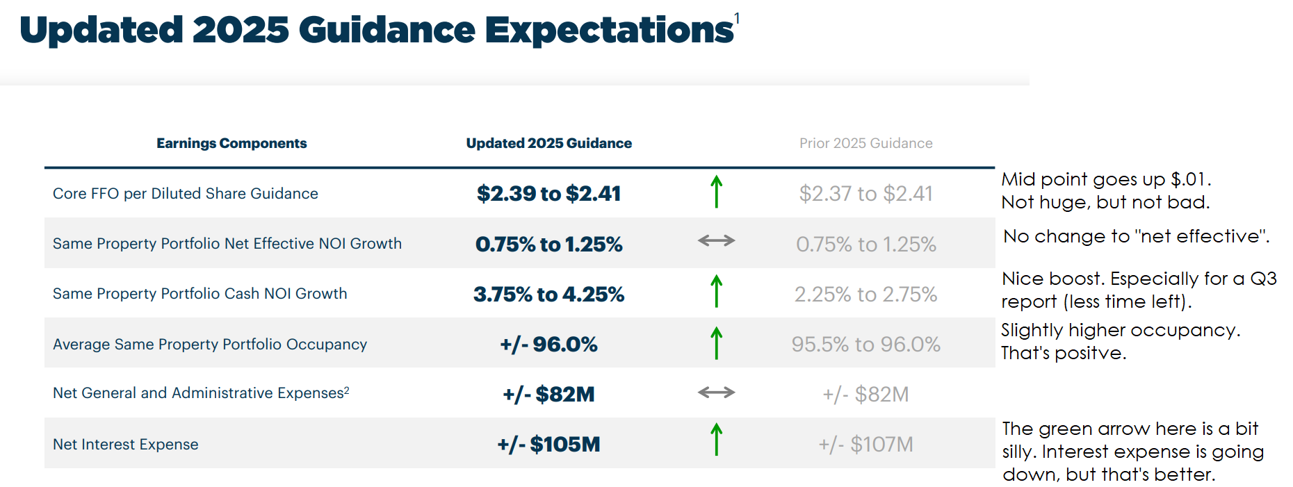 - Guidance for cash same store NOI foreshadows better AFFO per share.