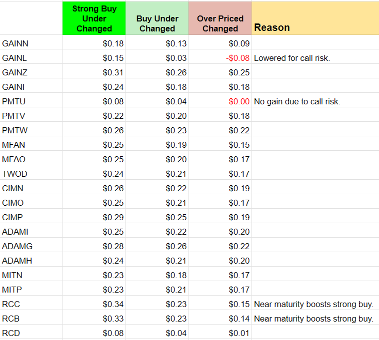 Note: I added targets for CIMP based on the prior interest rates so it could go through the update process along with the other baby bonds. This simply gives investors a better feel for the impact of the swing in interest rates and didn’t increase the time materially.