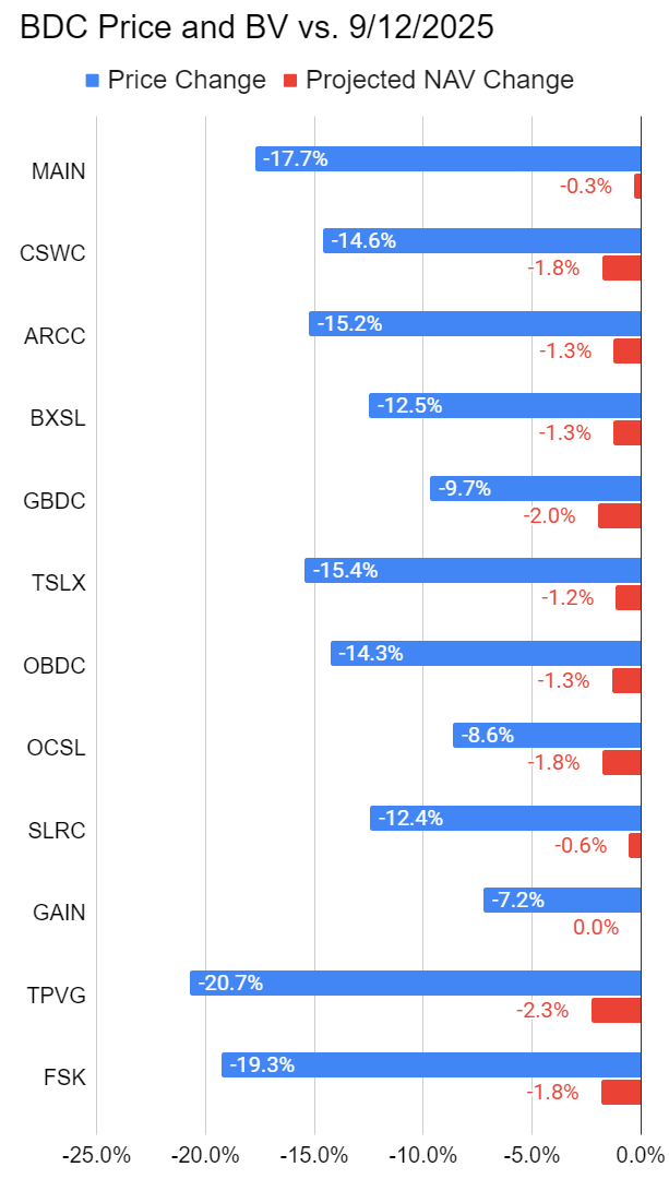 Commentary: The big story in our sectors lately is probably the decline in BDC valuations. On average the BDC share prices have declined by 14% over the last month (since 9/12/2025). That’s a big dip. Projected BVs are only down slightly. A portion of the dip can be explained by ex-dividend dates, but it’s only a modest portion.